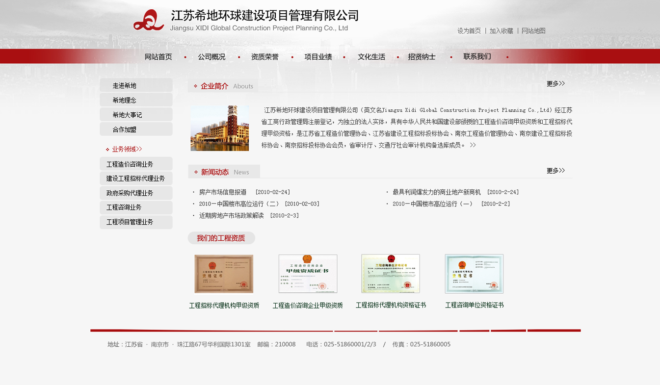 江蘇希地環球建設項目管理有限公司(英文名Jiangsu Xidi Global Construction Project Planning Co.,Ltd)經江蘇省工商行政管理局注冊登記,為獨立的法人實體,具有中華人民共和國建設部頒授的工程造價咨詢甲級資質和工程招標代理甲級資格,是江蘇省工程造價管理協會、江蘇省建設工程招標投標協會、南京工程造價管理協會、南京建設工程招標投標協會、南京招標投標協會會員,省審計廳、交通廳社會審計機構備選庫成員。公司主營工程項目管理、招標代理、造價審計、投資策劃、銷售代理、司法鑒定等咨詢服務業務。